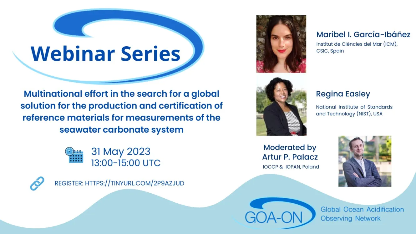 We are excited to invite you to attend the next Global Ocean Acidification Observing Network (GOA-ON) webinar organized jointly with IOCCP on "Multinational efforts in the search for a global solution for the production and certification of reference materials for measurements of the seawater carbonate system." The webinar will feature two presentations from Maribel I. García-Ibáñez (CSIC, Spain & IOCCP SSG member) and Regina Easley (NIST, USA), followed by a live discussion. The event will be moderated by Artur Palacz, IOCCP Project Officer.