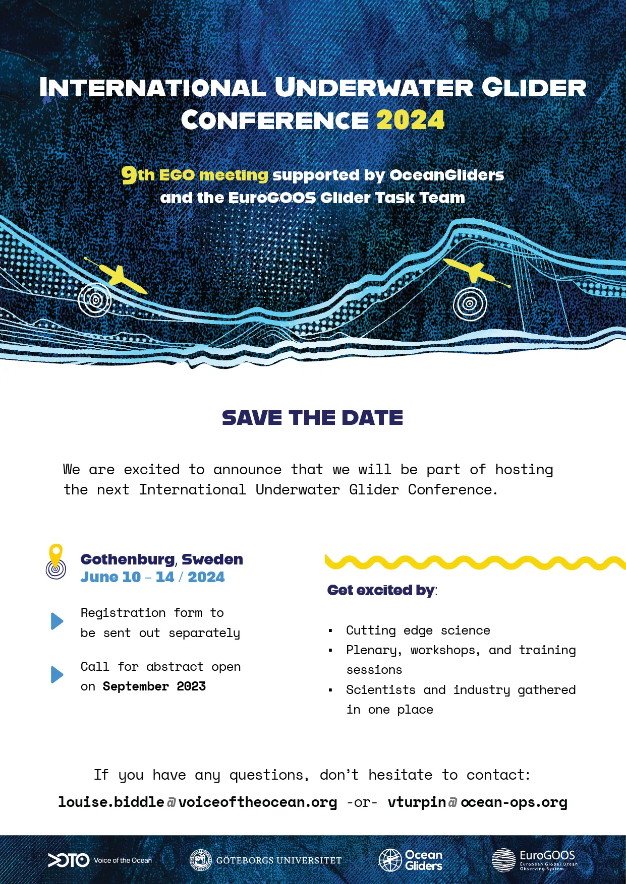 This is to let you know about the International Underwater Glider Conference scheduled on 10-14 June 2024 at Reveljen in Gothenburg, Sweden. This will be the 9th EGO meeting, supported by the OceanGliders and the EuroGOOS Glider Task Team. The International Underwater Glider Conference aims to bring together leading researchers, innovators, and experts from around the globe to exchange knowledge, share discoveries, and foster collaborations in the exciting realm of underwater gliders. The conference promises to be an engaging platform for sharing insights, addressing challenges, and shaping the future of this field.