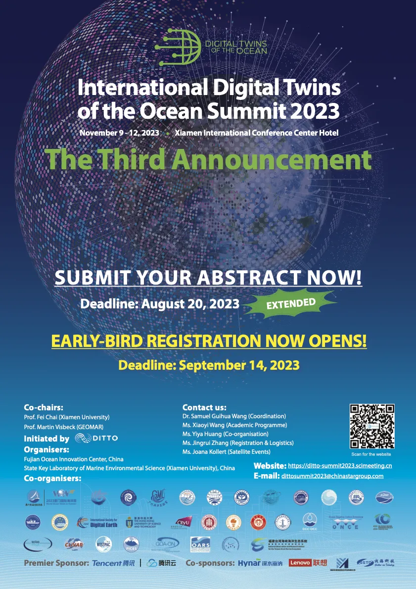 We are pleased to inform you about the upcoming International Digital Twins of the Ocean Summit 2023, which will be held in Xiamen, China on 9-12 November 2023. Taking the great arena of 2023 World Ocean Week in Xiamen, the DITTO Summit 2023 will be co-organised by the Fujian Ocean Innovation Center and State Key Laboratory of Marine Environmental Science (Xiamen University), and to gather global participants with themes focusing on sharing the latest knowledge about DTOs and discussing future actions on advancing and applying them. The abstract submission's deadline is extended to 20 August 2023. For further details please read the Third Announcement.