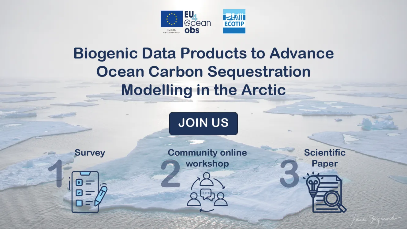 We would like to let you know about an open invitation to join an online workshop to discuss "Biogenic Data Products to Advance Ocean Carbon Sequestration Modelling in the Arctic." This 3-stage initiative, co-organized by EU H2020 ECOTIP and the EU4OceanObs projects, consists of a brief online survey, an online workshop to be held on 18-19 October 2023, and a final perspectives paper to be published based on the workshop outcomes. The deadline to complete the survey, which is a prerequisite to join the workshop, has been extended until early next week (4 October 2023).