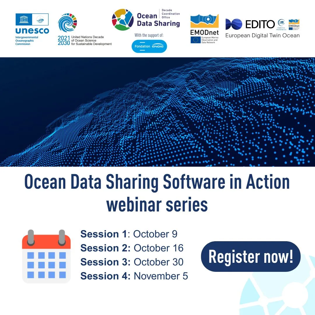 We would like to encourage you to participate in an exciting webinar series exploring how data sharing software is transforming marine science. This online event is scheduled for October and November 2025 and is organised by the Decade Coordination Office for Ocean Data Sharing (DCO-ODS) and the European Marine Observation and Data Network (EMODnet).