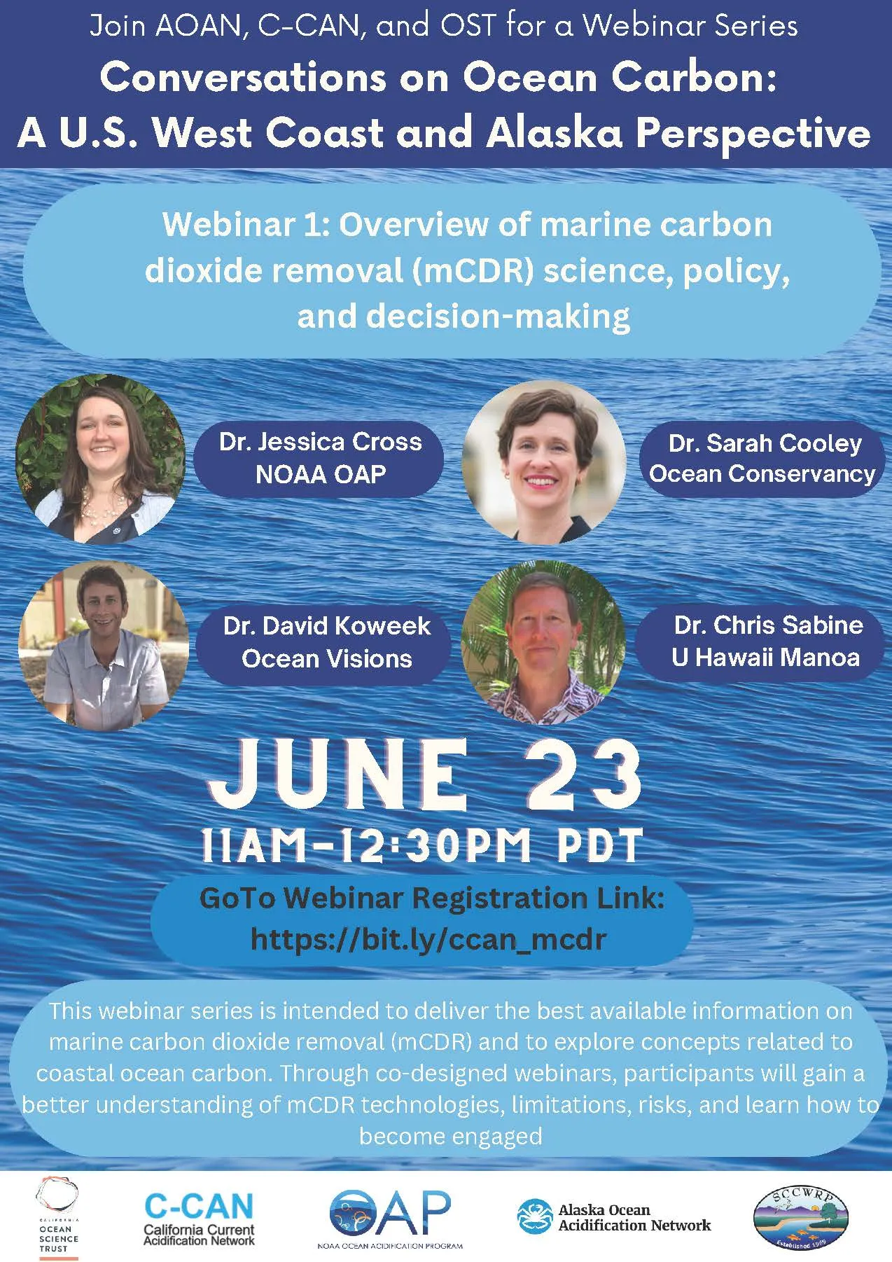 This is to let you know about the upcoming webinar on marine carbon dioxide removal. This webinar series presented by the Coastal Acidification Networks along the West Coast and Alaska as well as California Ocean Science Trust is intended to deliver the best available information on marine carbon dioxide removal (mCDR) and to explore concepts related to coastal ocean carbon. Through this series of co-designed webinars, participants will gain a better understanding of mCDR technologies, limitations, risks, and learn how to become engaged.
